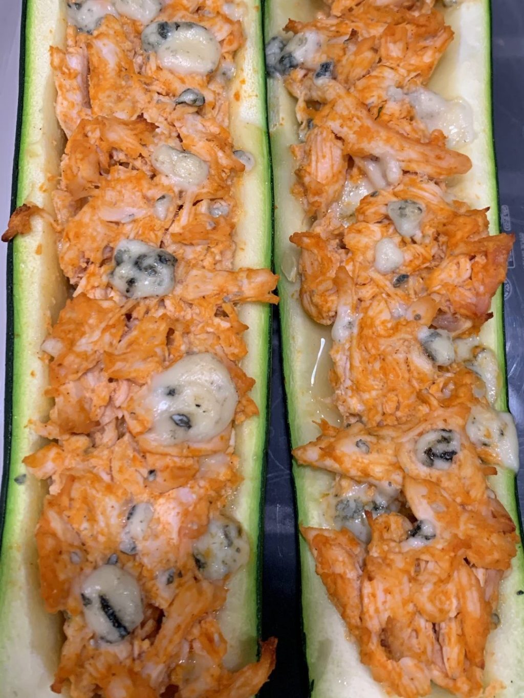- Pull zucchini out of the oven, flip over, and scoop buffalo chicken into zucchini halves. Once all chicken is placed in zucchini halves, add blue cheese crumbles to top it off.
