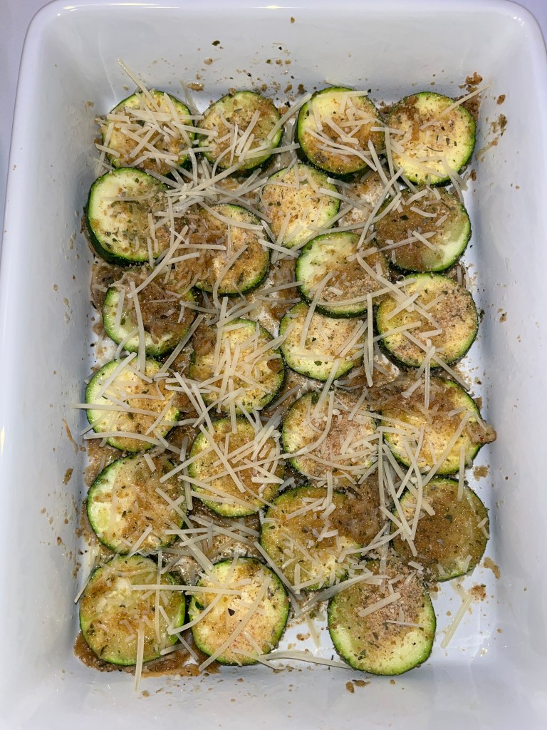 - Arrange the zucchini rounds as a single layer, if possible, and top with breadcrumbs and shredded cheese, reserving some for later.