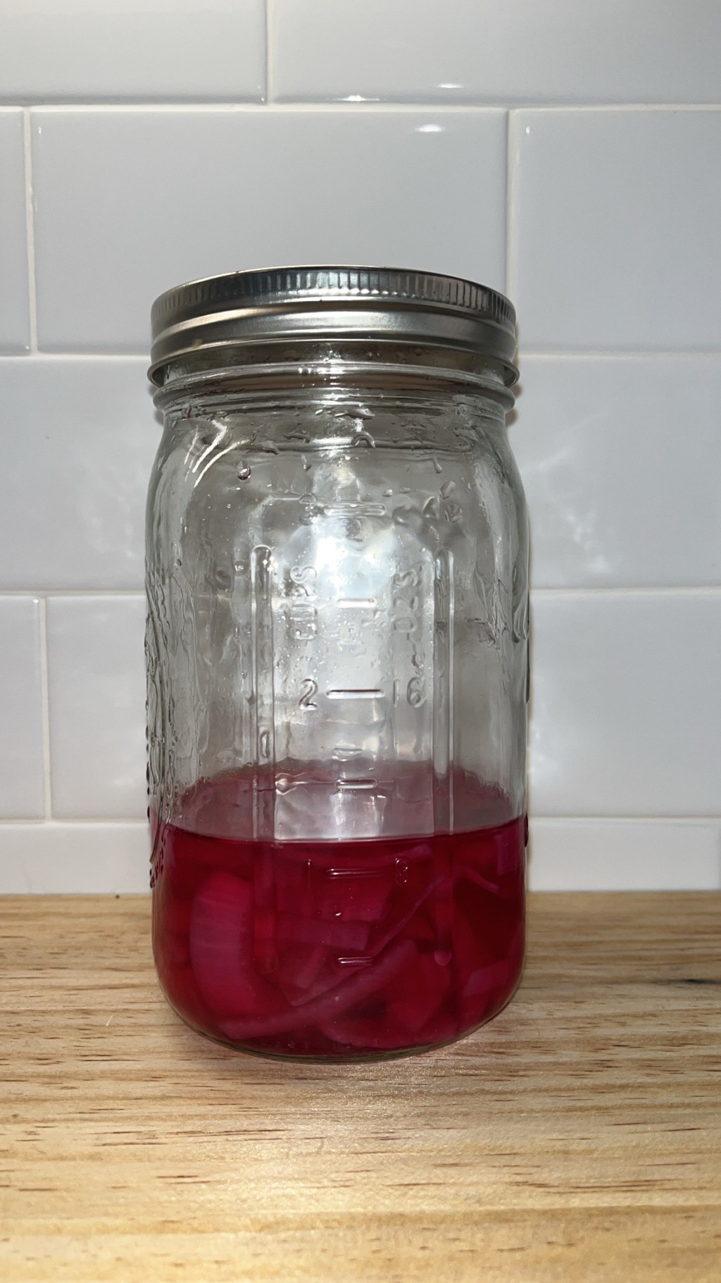 - Pour the hot liquid mixture, once boiled, over the onions in the mason jar and leave on the counter to completely cool, about 30 minutes.