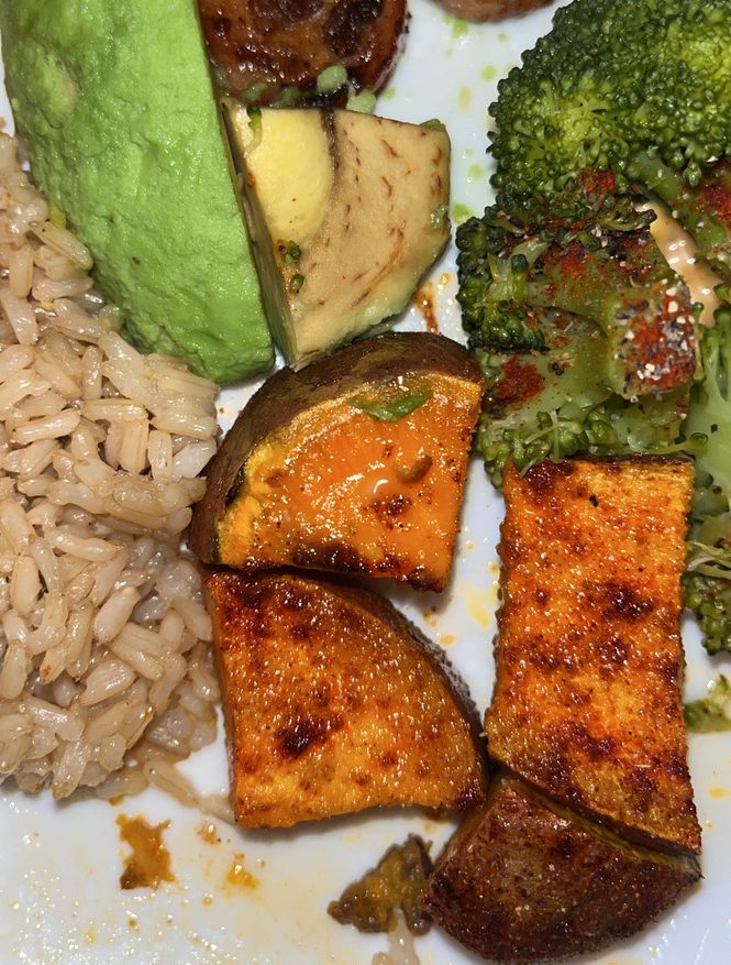 This is a newer thing we’ve been doing with sweet potatoes. If you can’t tell by now, I LOVE sweet potatoes, so anytime I can incorporate them into a meal, I do. If you’d prefer to use different seasonings, feel free to swap them for seasonings you love 😊