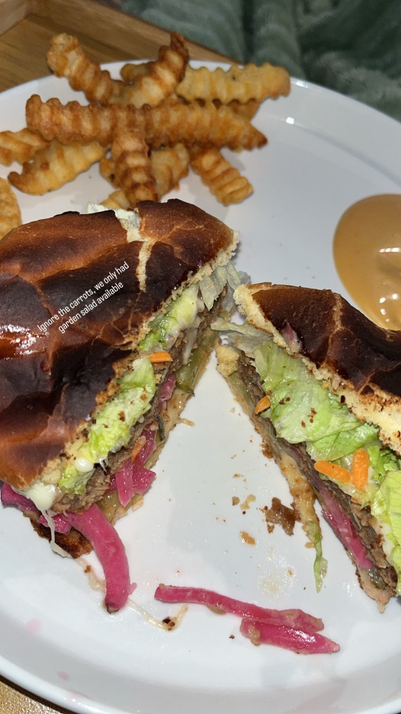 - Cook the veggie burger and fries according to directions on packaging. We usually cook the burger in the oven, or when it’s nice out, we’ll put it on the grill and the fries go into the air fryer. This is the only part that requires any cooking.